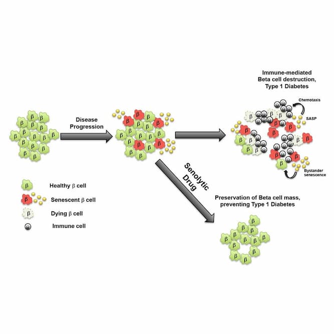 Type 1 diabetes (T1D) is an organ-specific autoimmune disease characterized by hyperglycemia due to progressive loss of pancreatic beta cells. Immune-mediated beta cell destruction drives the disease, but whether beta cells actively participate in the pathogenesis remains unclear. Here, we show that during the natural history of T1D in humans and the non-obese diabetic (NOD) mouse model, a subset of beta cells acquires a senescence-associated secretory phenotype (SASP). Senescent beta cells upregulated pro-survival mediator Bcl-2, and treatment of NOD mice with Bcl-2 inhibitors selectively eliminated these cells without altering the abundance of the immune cell types involved in the disease. Significantly, elimination of senescent beta cells halted immune-mediated beta cell destruction and was sufficient to prevent diabetes. Our findings demonstrate that beta cell senescence is a significant component of the pathogenesis of T1D and indicate that clearance of senescent beta cells could be a new therapeutic approach for T1D.” (1)