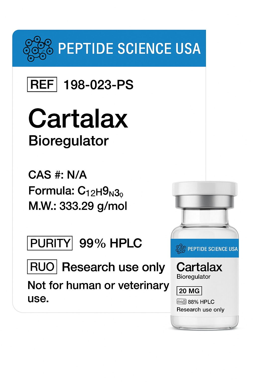 Cartalax is a short peptide with bioregulatory properties. It primarily affects fibroblasts, which are ubiquitous cells found in everything from cartilage to skin to blood vessels and the kidneys. Research indicates that Cartalax affects cell proliferation and apoptosis through several molecular mechanisms including increasing Ki-67 levels, decreasing p53 signaling, and activating NF-kB signaling. Cartalax is classified as an anti-aging bioregulator because it reduces senescence, restores function to older cells, and appears to slow overall tissue aging.