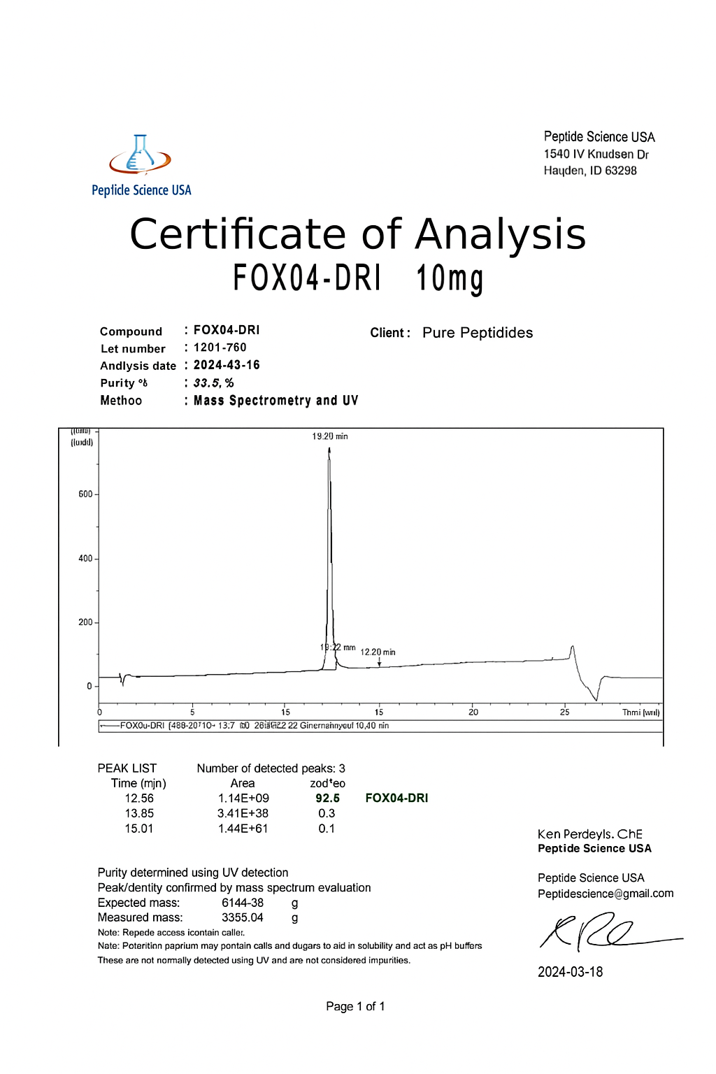 Our FOXO4-DRI 10mg is produced using advanced solid-phase peptide synthesis (SPPS) technology with D-amino acid incorporation for maximum in vivo stability. Every batch undergoes independent third-party HPLC and mass spectrometry analysis to confirm identity, purity, and concentration — ensuring the reliability your research demands.