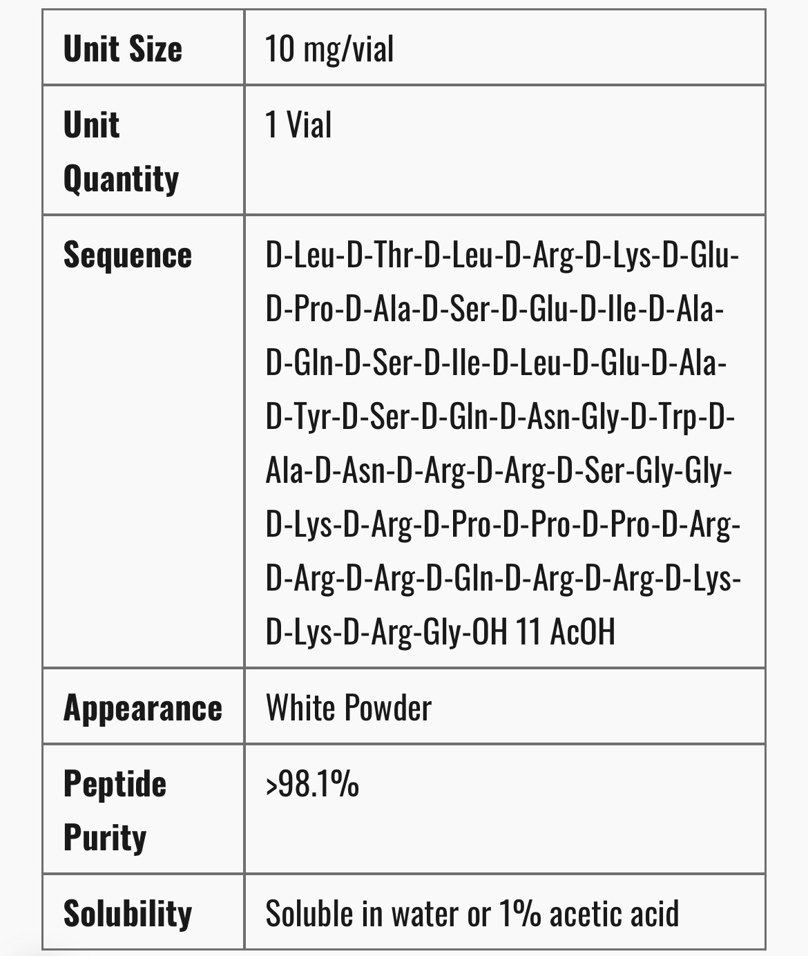 - Peptide Name: FOXO4-DRI (D-Retro-Inverso FOXO4 Peptide)