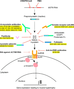 IGF-1 binds to at least two cell surface receptors: IGF-1R and the insulin receptor. The IGF-1 receptor is referred to as the “physiologic” receptor because IGF-1 binds to it with significantly higher affinity (approximately 100 times higher) than it does to the insulin receptor. By binding to IGF-1R, IGF-1 can affect metabolism, cell growth (hypertrophy), differentiation and cell division (hyperplasia), prevention of cell death (apoptosis), normal development, and even malignant growth. IGF-1R has been implicated in several different types of cancer include breast, prostate, and lung cancer. IGF-1 also binds to the insulin receptor and activates it, thereby encouraging cells to take up glucose from the blood stream. The effects of IGF-1 on muscle cells are three-fold. Firstly, IGF-1 encourages hyperplasia, or an increase in the number of muscle cells. Secondly, IGF-1 has a strong effect on skeletal muscle – In regards to the life span of satellite cells. Satellite cells support muscle cells, providing them with needed nutrients and helping them to operate efficiently. By increasing the lifespan of these cells, IGF-1 helps to increase their number with muscle tissue. Finally, IGF-1 encourages differentiation of myoblasts, which is to say that it encourages the conversion of stem cell progeny from nonspecific pluripotent stem cells into dedicated muscle tissue. In this way, IGF-1